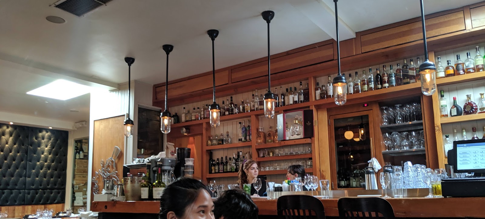 Inside was simple: wide hallway with white ceiling and mirrored wall; the only sign of extravagance was the bar, a gleaming wood behemoth that dominated half the bistro, the back wall an Aladdin cavern glittering with a rainbow selection of liquor bottles--if the heart of a restaurant is the bar, this had a huge enchanted heart.